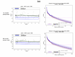 Fig. 3 shows the trends in the rainfall totals associated with GMST in both regions and for both accumulations, along with the respective return period plots. Table 2 summarises the results. The annual and five-year accumulated rainfall have return periods ranging 12 to 25 years in today’s climate. The observed five-year rainfall over Iran is relatively rare, corresponding to a return period of approximately 25 years, indicating only a ~4% probability of experiencing rainfall totals as low as those recorded during 2021-2025. Despite the high year-to-year variability in the annual rainfall in both regions, there is an emerging decreasing trend associated with GMST ( as seen by the red lines visible below the blue lines indicating that low rainfall events are becoming more frequent and drier in today’s climate (right panels in Figure 3). The trends are more discernible for the five-year accumulations suggesting relatively stronger influence of warming on multi-year droughts. However, these changes are small, with uncertainties encompassing no change (see Table 2), which is in part driven by high variability. Therefore, we refrain from making a quantitative assessment about the role of climate change on rainfall lows, but note that the observed tendencies point toward warming contributing to more frequent and persistent periods of low rainfall.