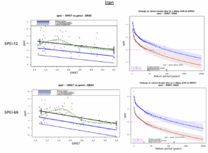 Table 1: Estimated return periods of SPEI-12 and SPEI-60 over Iran and the TE-Basin, along with the respective changes in probability ratio and magnitudes associated with 1.3°C of global warming. Numbers in brackets are 95% confidence intervals obtained by bootstrapping. The last column shows the estimated SPEI in a 1.3°C cooler climate for events with 2025 return period. These values are obtained by subtracting the magnitude change associated with 1.3 °C of warming from the 2025 SPEI values.